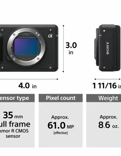 L’ILX-LR1 è progettata per essere una fotocamera a obiettivo intercambiabile compatta e leggera con un sensore d’immagine full-frame da 35 mm. Ha approssimativamente le dimensioni di 10 cm in larghezza x 7,4 cm in altezza x 4,2 cm in profondità, con un peso di circa 0,24 kg, senza monitor, mirino o batteria, ma incorpora le funzionalità necessarie per le applicazioni industriali.